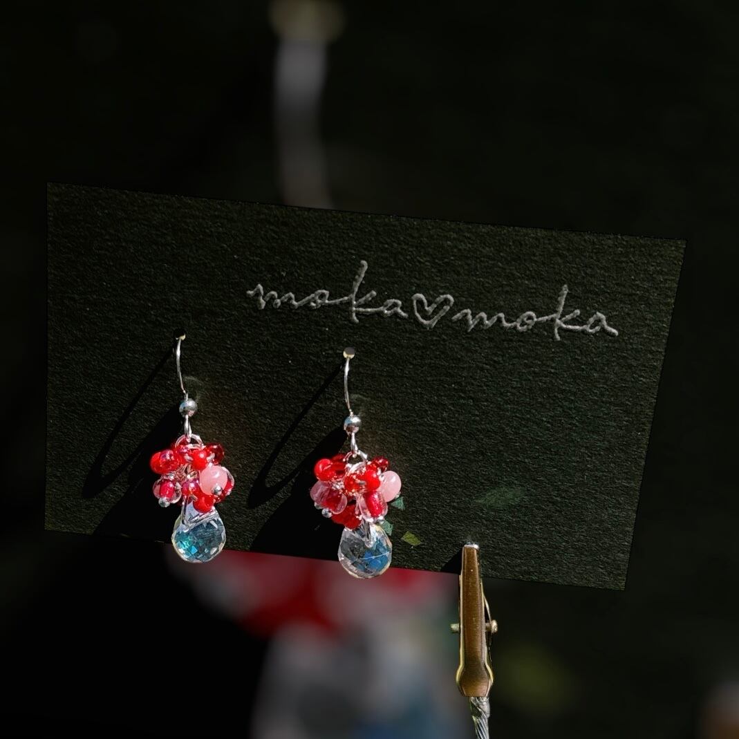 多様な赤のビーズが織りなす情熱的な色合いが、耳元を美しく彩るピアスです。
