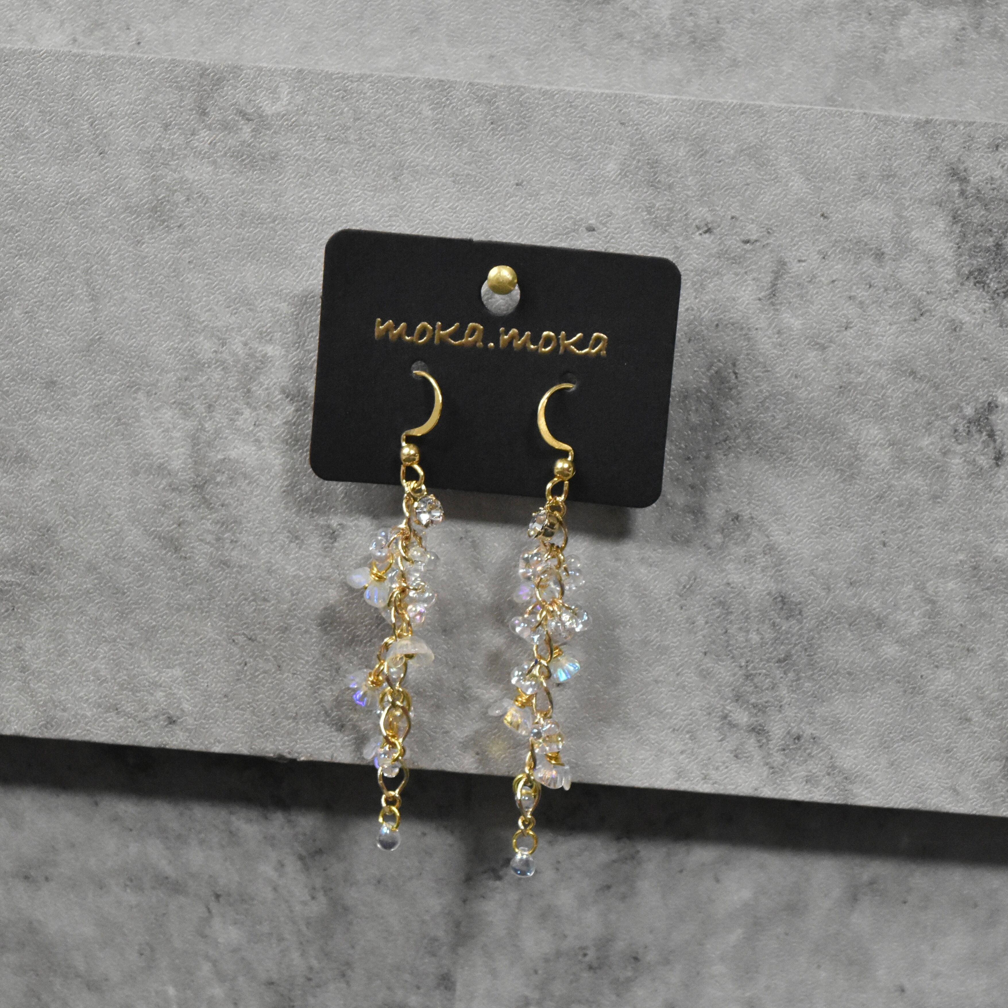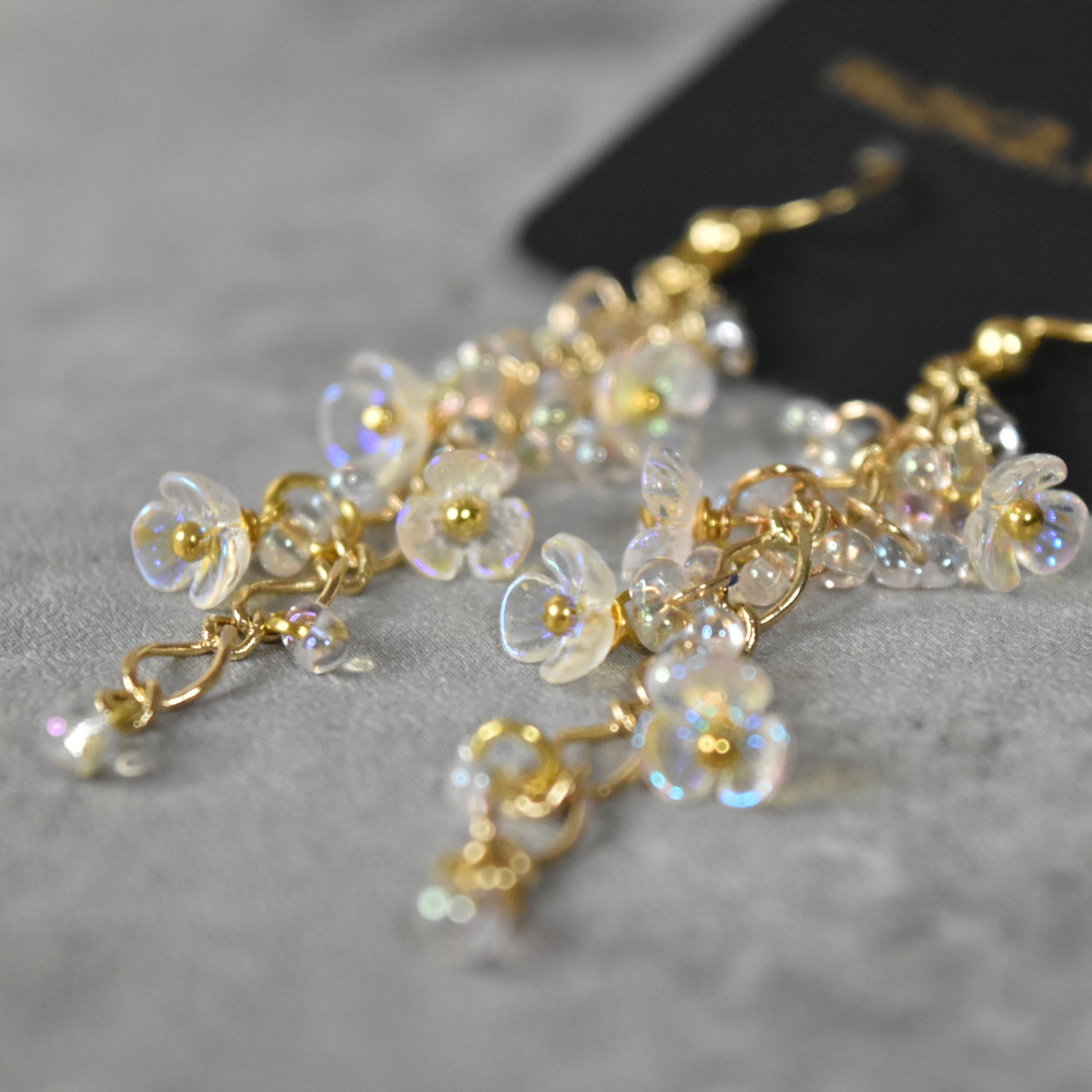 ゴールドのチェーンに咲く透明感あふれるフラワービーズが、動くたびに繊細に揺れ、