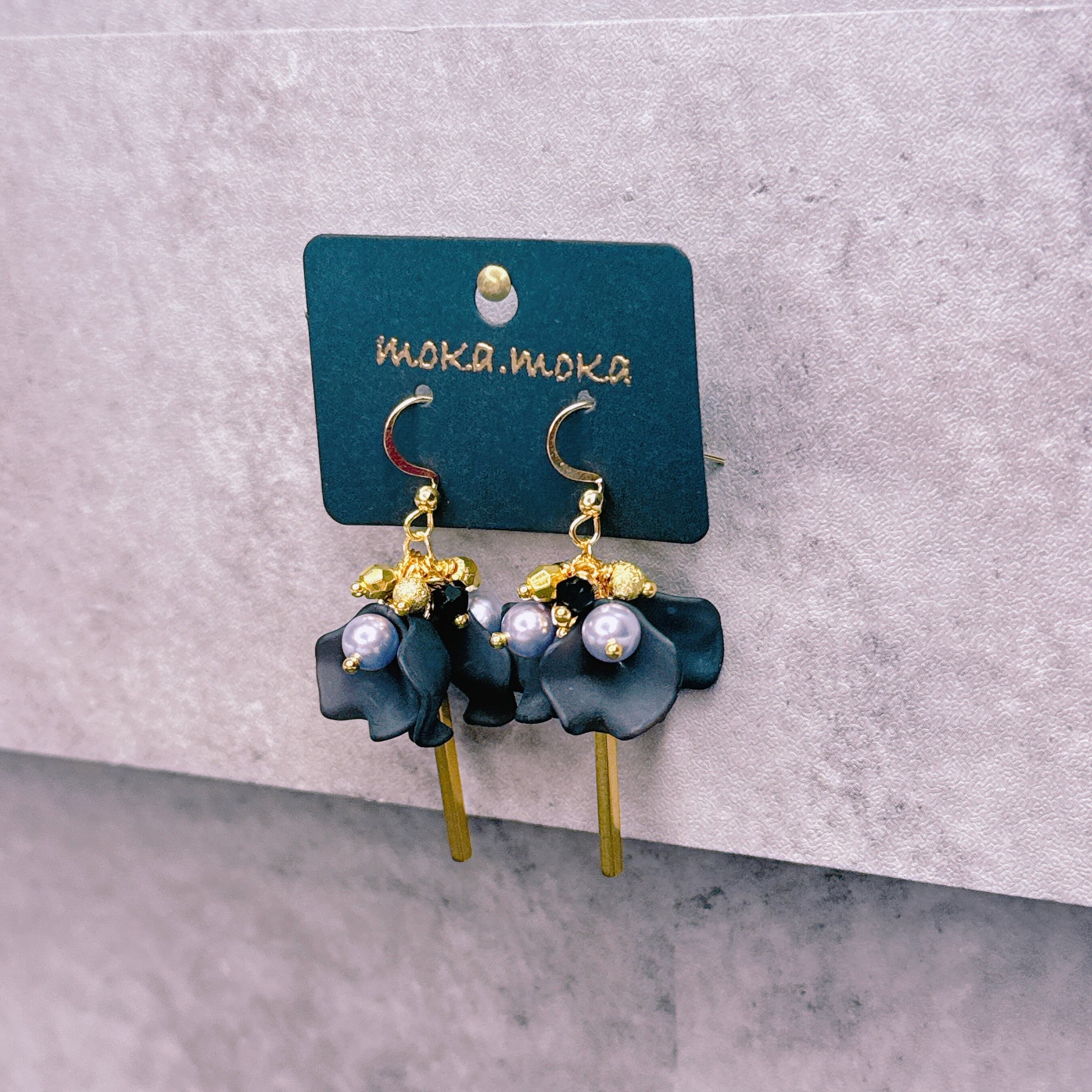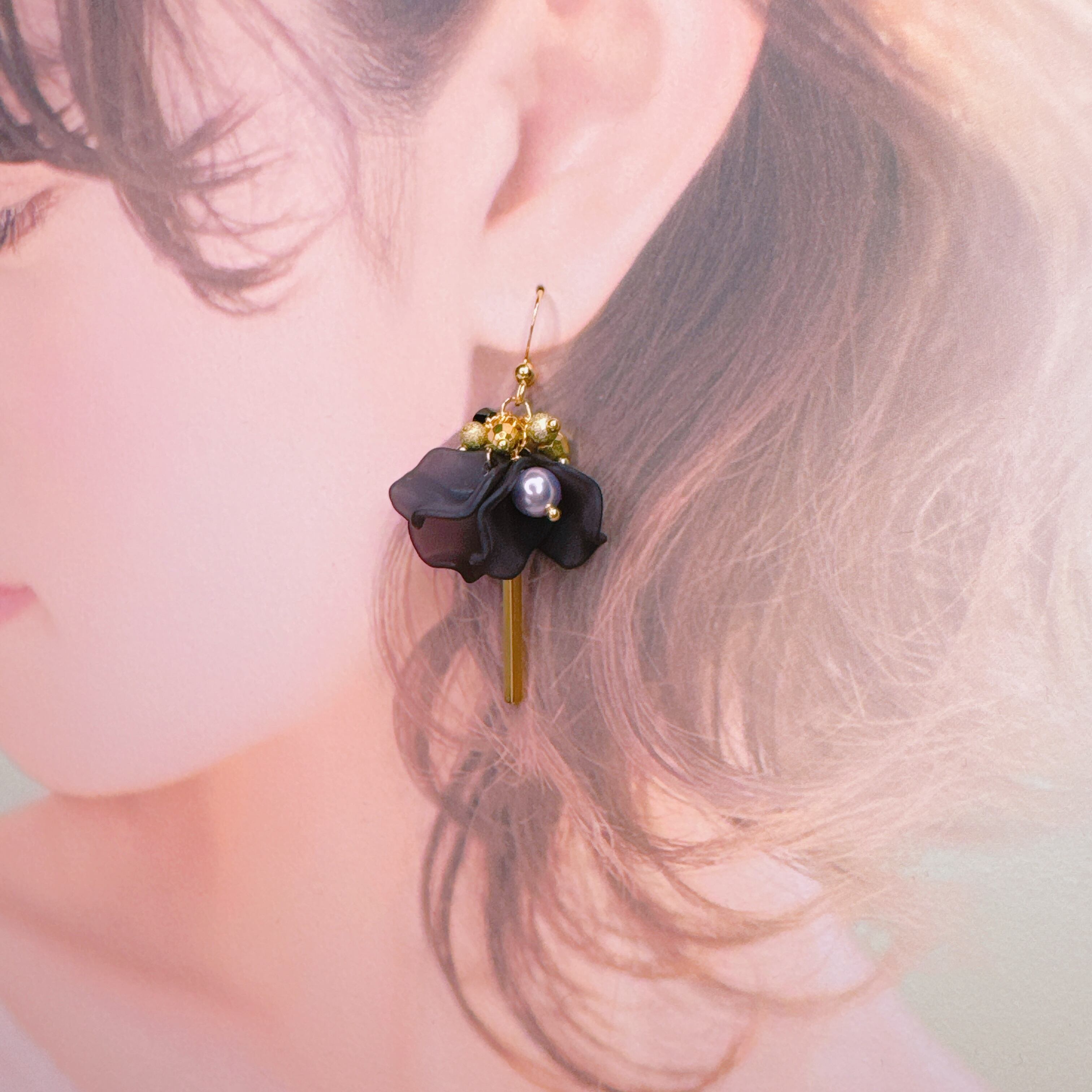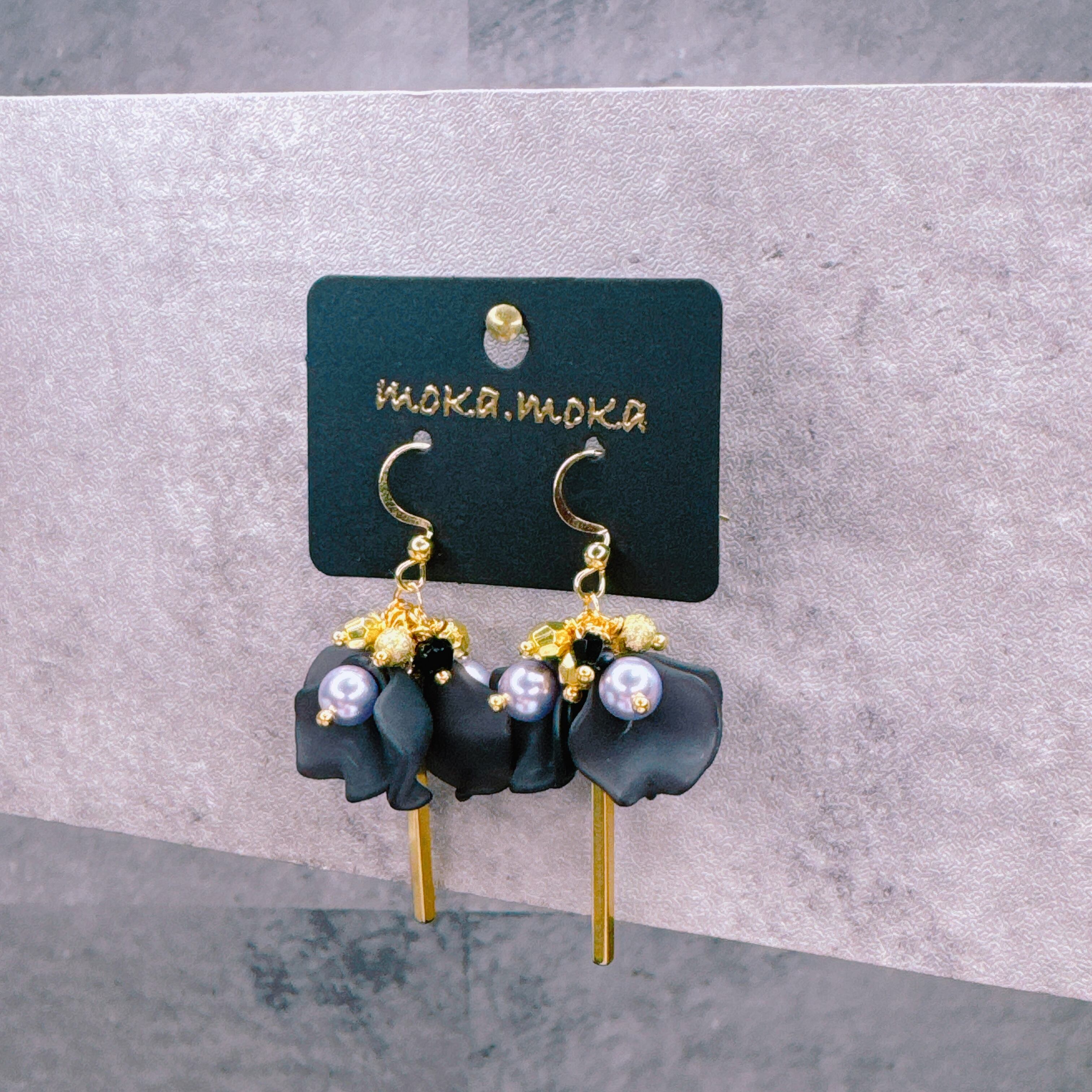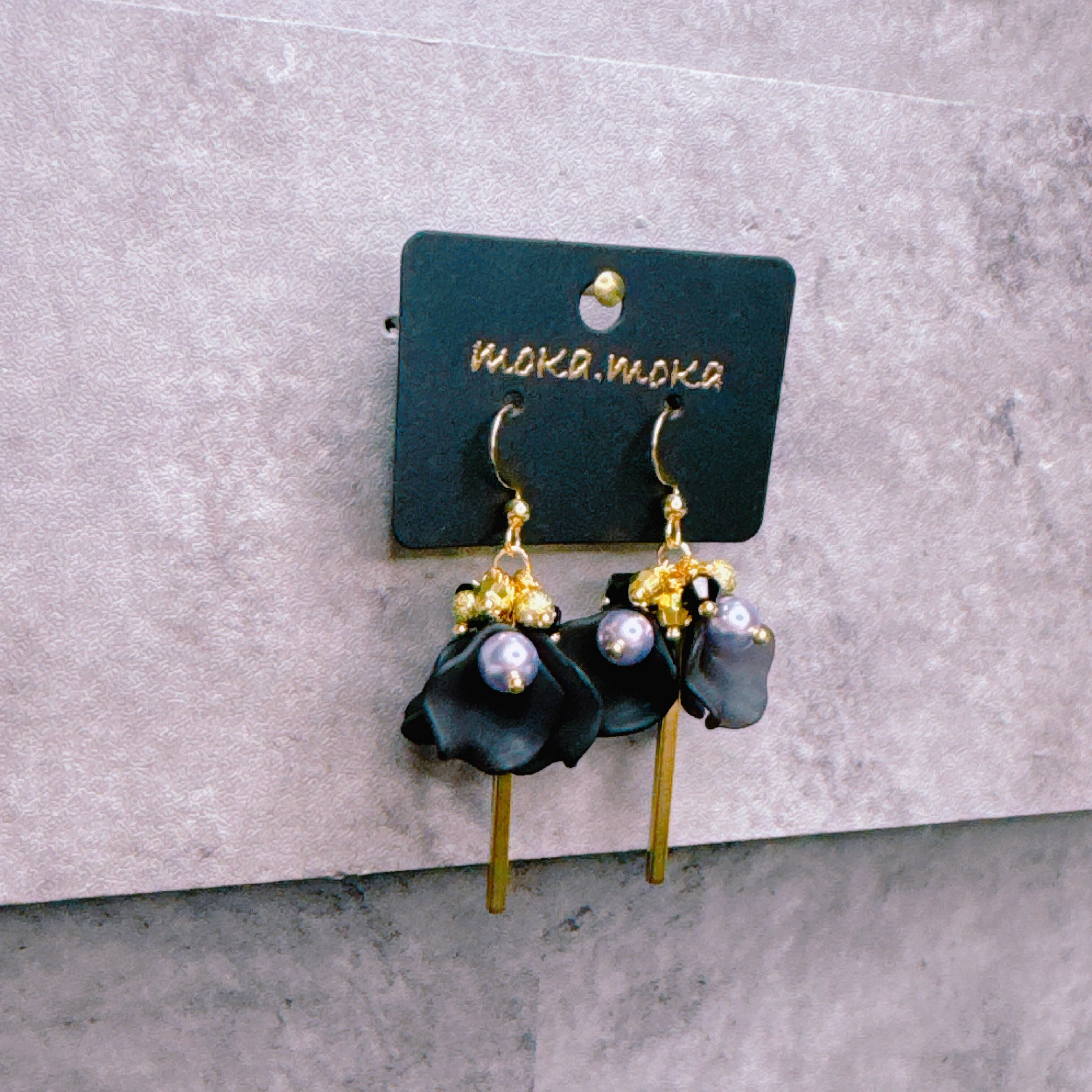 深みのあるブラックフラワーと上品なパール、
